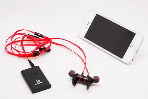 受信機として使う場合は、このようにMK1に有線のイヤフォンなどを接続すれば、iPhoneなどのBluetooth機器から音楽を飛ばして音楽を聴けます。Bluetoothに対応していないイヤフォンやスピーカーが、すべて無線対応になります。